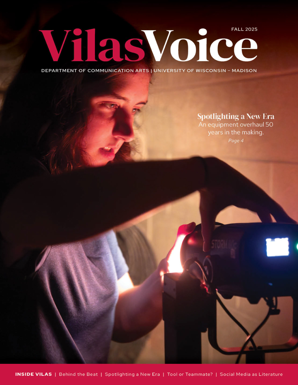 Vilas Voice is a bi-annual newsletter for the Department of Communication Arts alumni and friends. The newsletter is shared digitally in the spring and in print in the fall. Stories highlight courses, research impacts, equipment and facility updates, alumni successes, and student achievements. To learn what’s happening in Vilas Hall each semester, check out the latest edition of the Vilas Voice.
